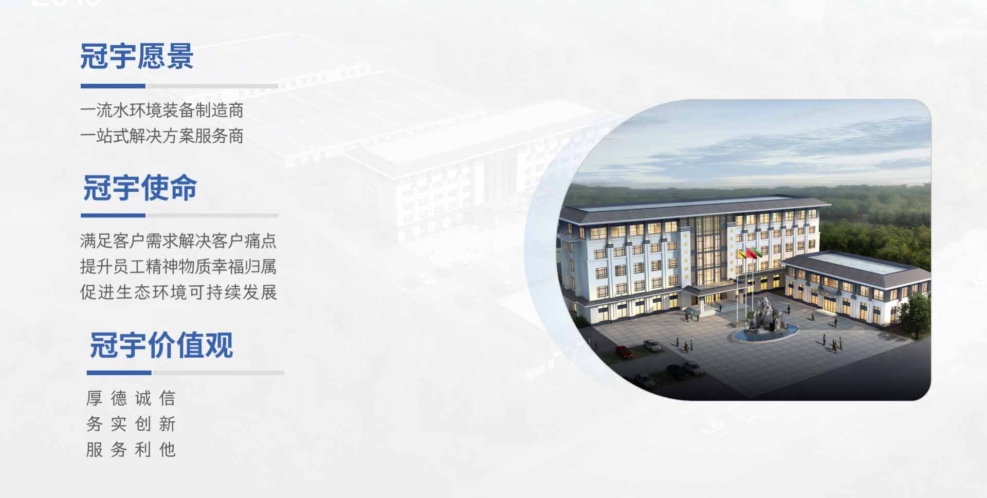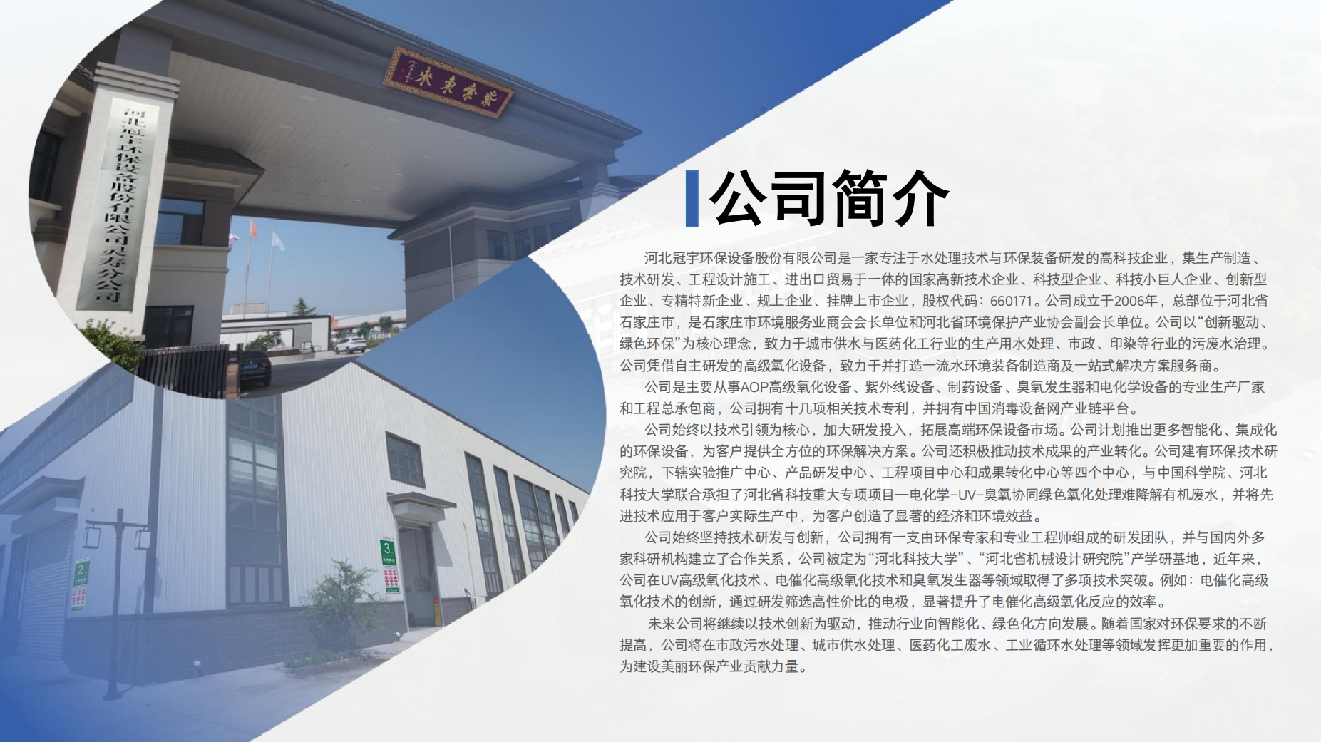 河北冠宇環(huán)保設(shè)備股份有限公司是一家專(zhuān)注于水處理技術(shù)與環(huán)保裝備研發(fā)的高科技企業(yè),集生產(chǎn)制造、技術(shù)研發(fā)、工程設(shè)計(jì)施工、進(jìn)出口貿(mào)易于一體的國(guó)家高新技術(shù)企業(yè)、科技型企業(yè)、科技小巨人企業(yè)、創(chuàng)新型企業(yè)、專(zhuān)精特新企業(yè)、規(guī)上企業(yè)、掛牌上市企業(yè),股權(quán)代碼:660171。公司成立于2006年,總部位于河北省石家莊市,是石家莊市環(huán)境服務(wù)業(yè)商會(huì)會(huì)長(zhǎng)單位和河北省環(huán)境保護(hù)產(chǎn)業(yè)協(xié)會(huì)副會(huì)長(zhǎng)單位。公司以“創(chuàng)新驅(qū)動(dòng)、綠色環(huán)?!睘楹诵睦砟?,致力于城市供水與醫(yī)藥化工行業(yè)的生產(chǎn)用水處理、市政、印染等行業(yè)的污廢水治理。公司憑借自主研發(fā)的高級(jí)氧化設(shè)備,致力于并打造一流水環(huán)境裝備制造商及一站式解決方案服務(wù)商。